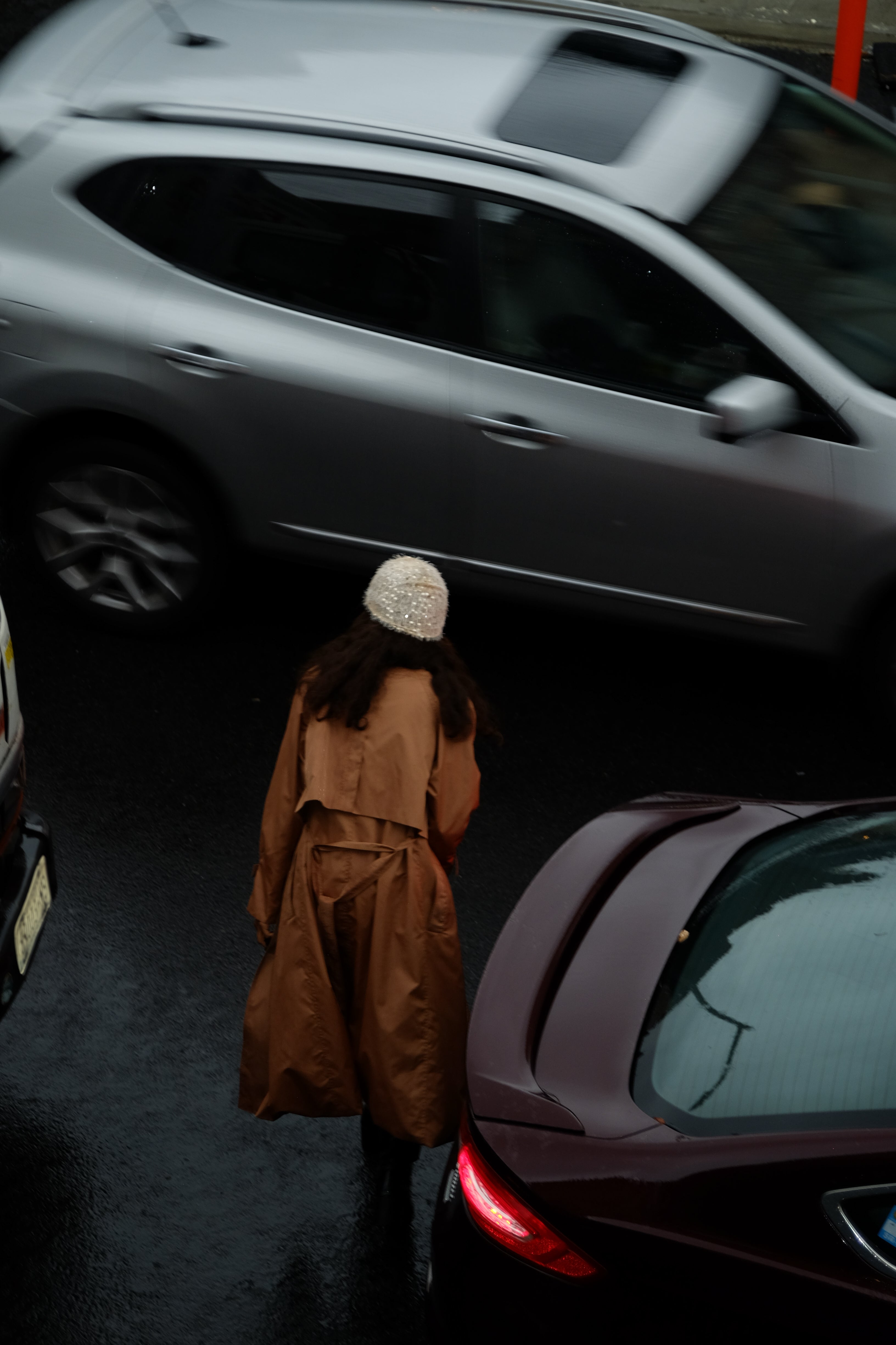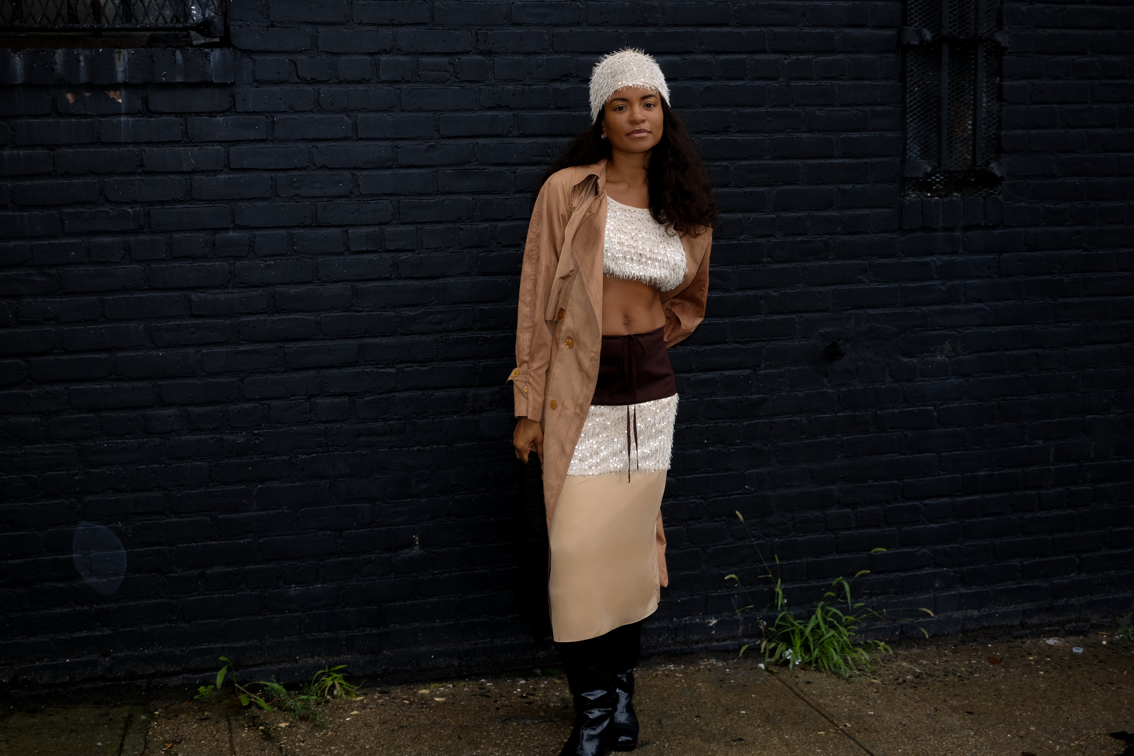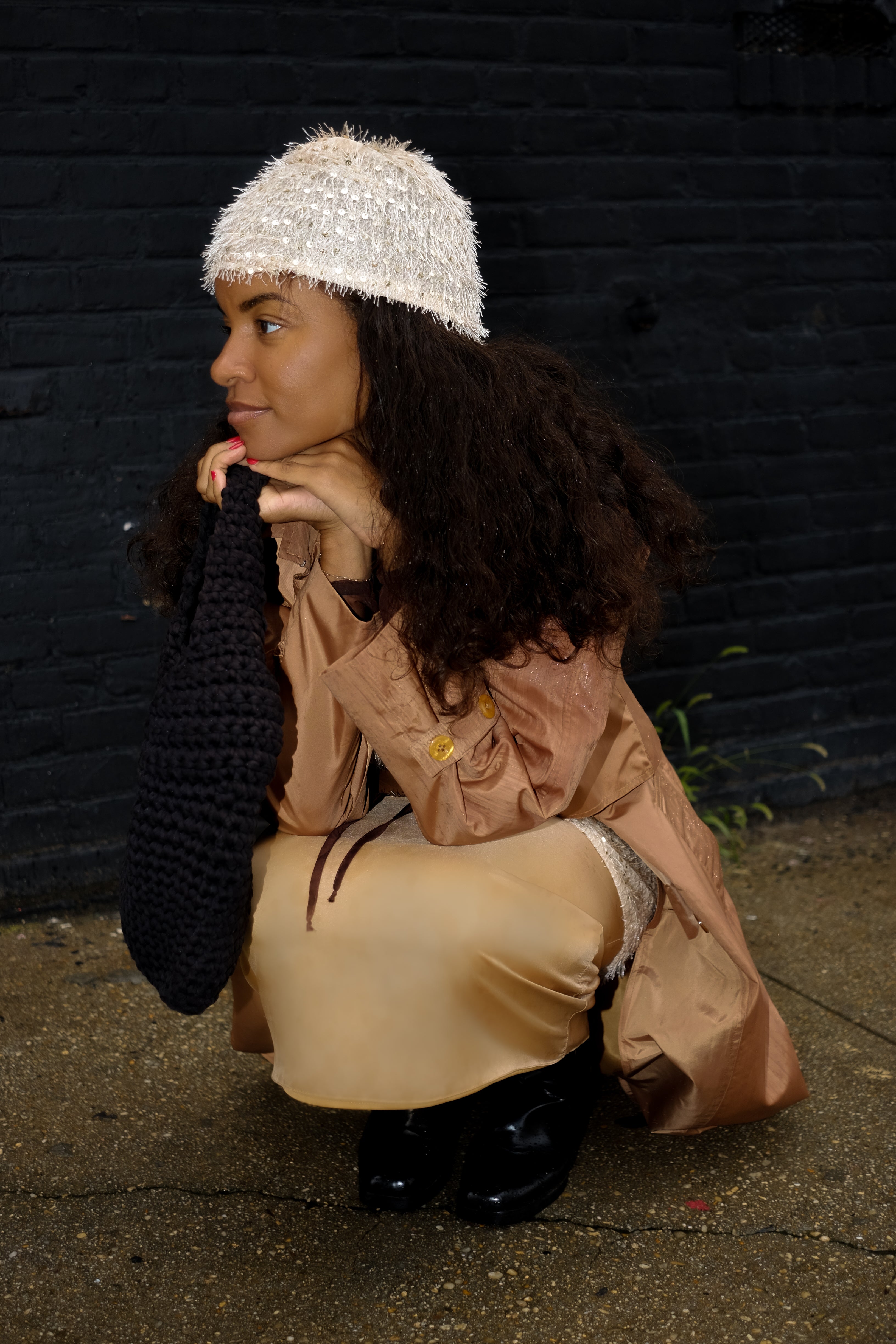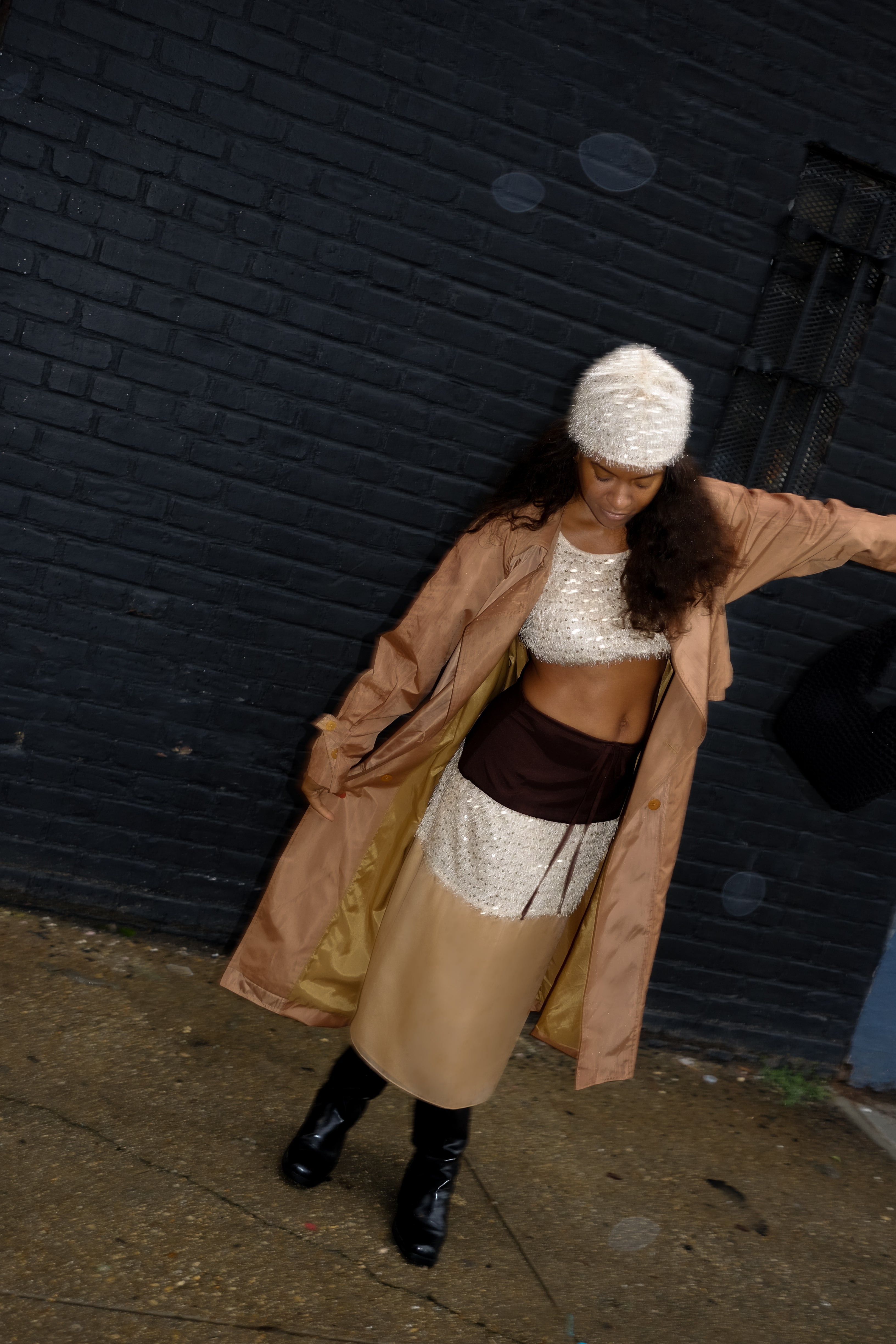 Kai styled by Gemsun and Alexis Badiyi wearing the FRITZI SKIRT DRESS, FRITZI TOP and FRITZI CAP combined with our COAT in caramel and KORB BAG 100% recycled in black