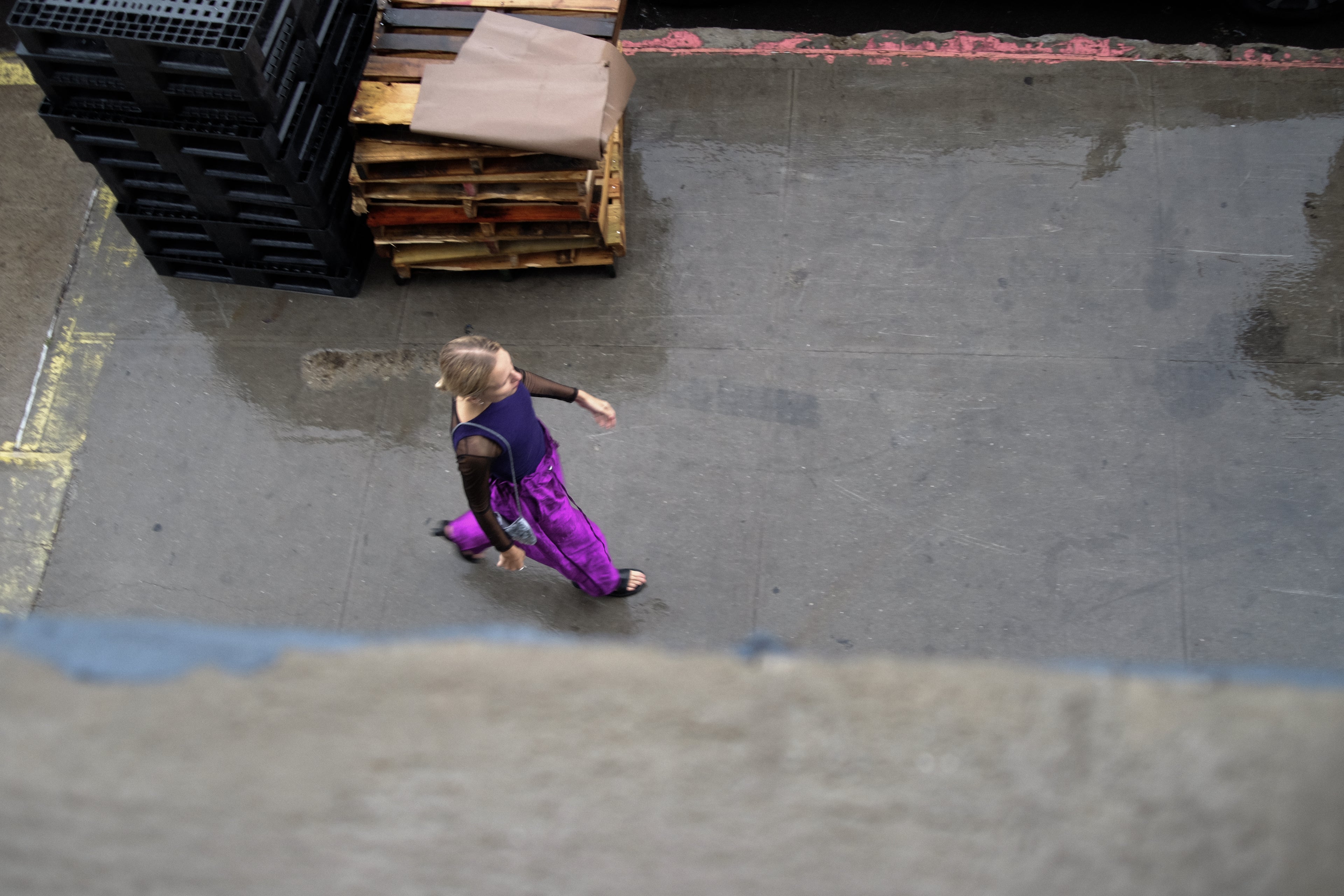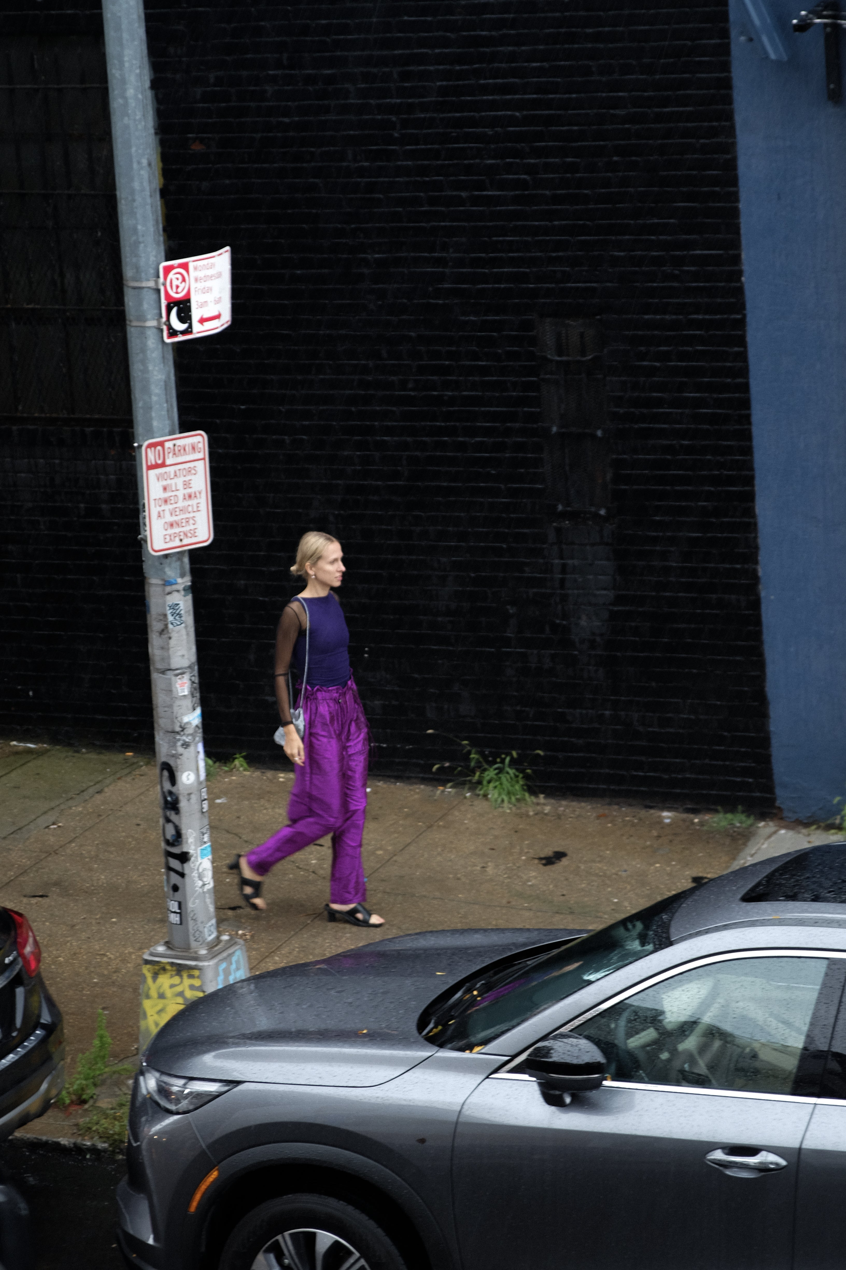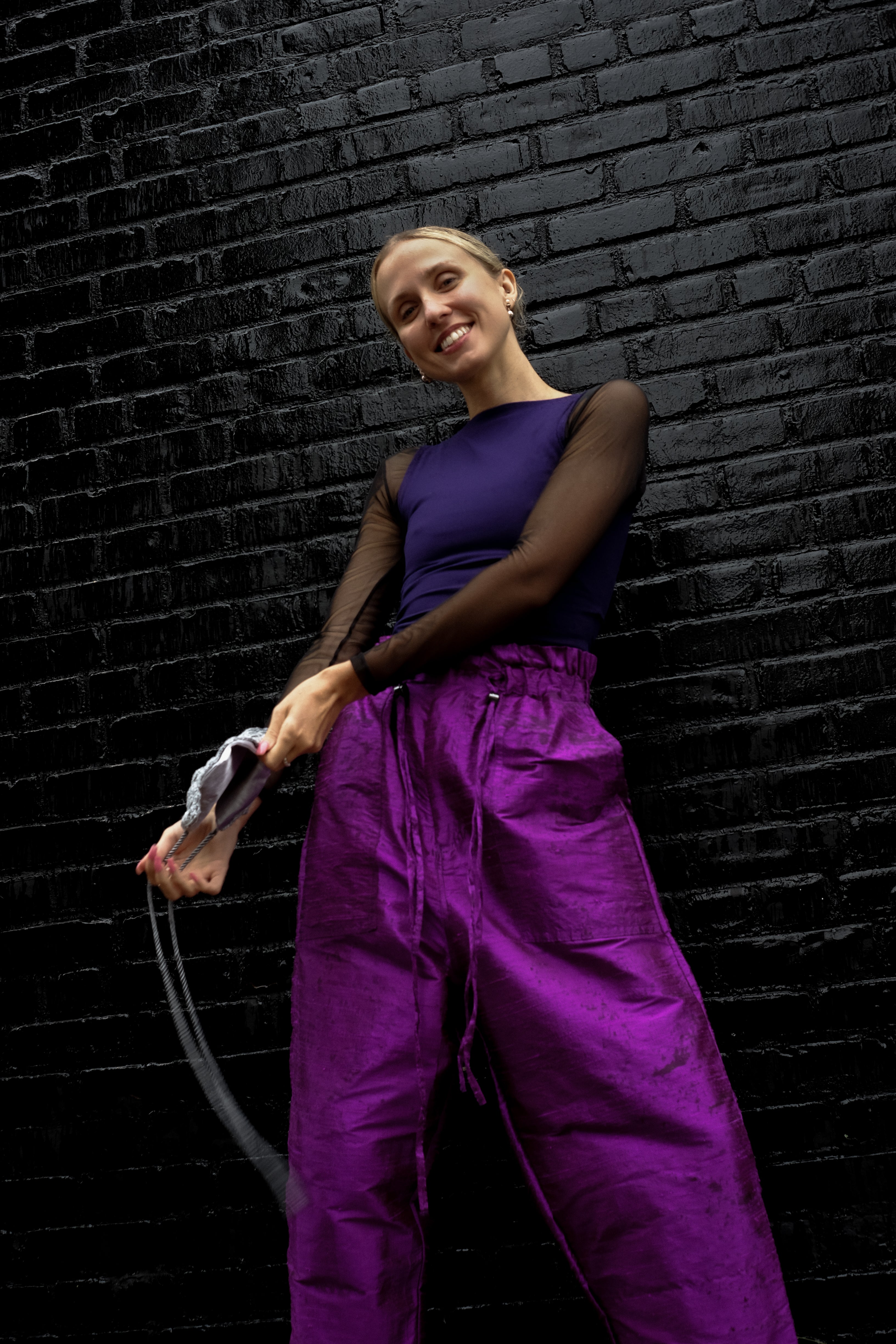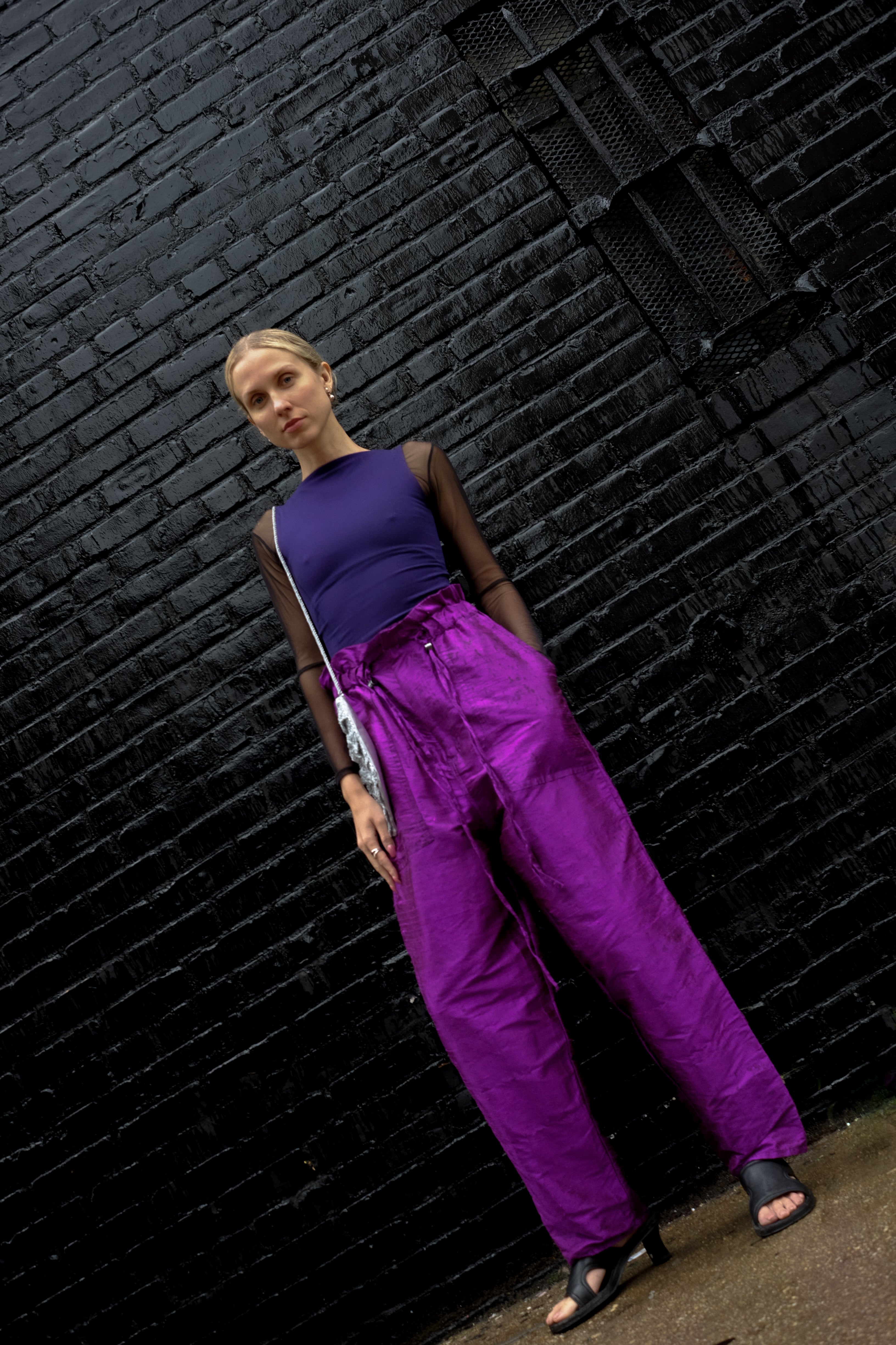 Karina styled by Gemsun and Alexis Badiyiwearing the SILK DIANE PANTS, MESH LONGSLEEVE in black, CLASSIC TOP in purple and SUNSET PURSE in silver