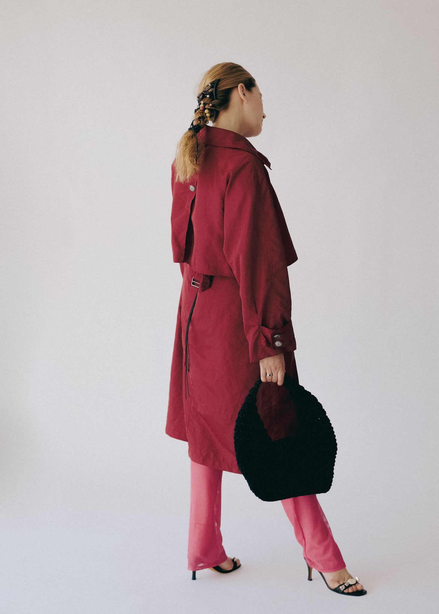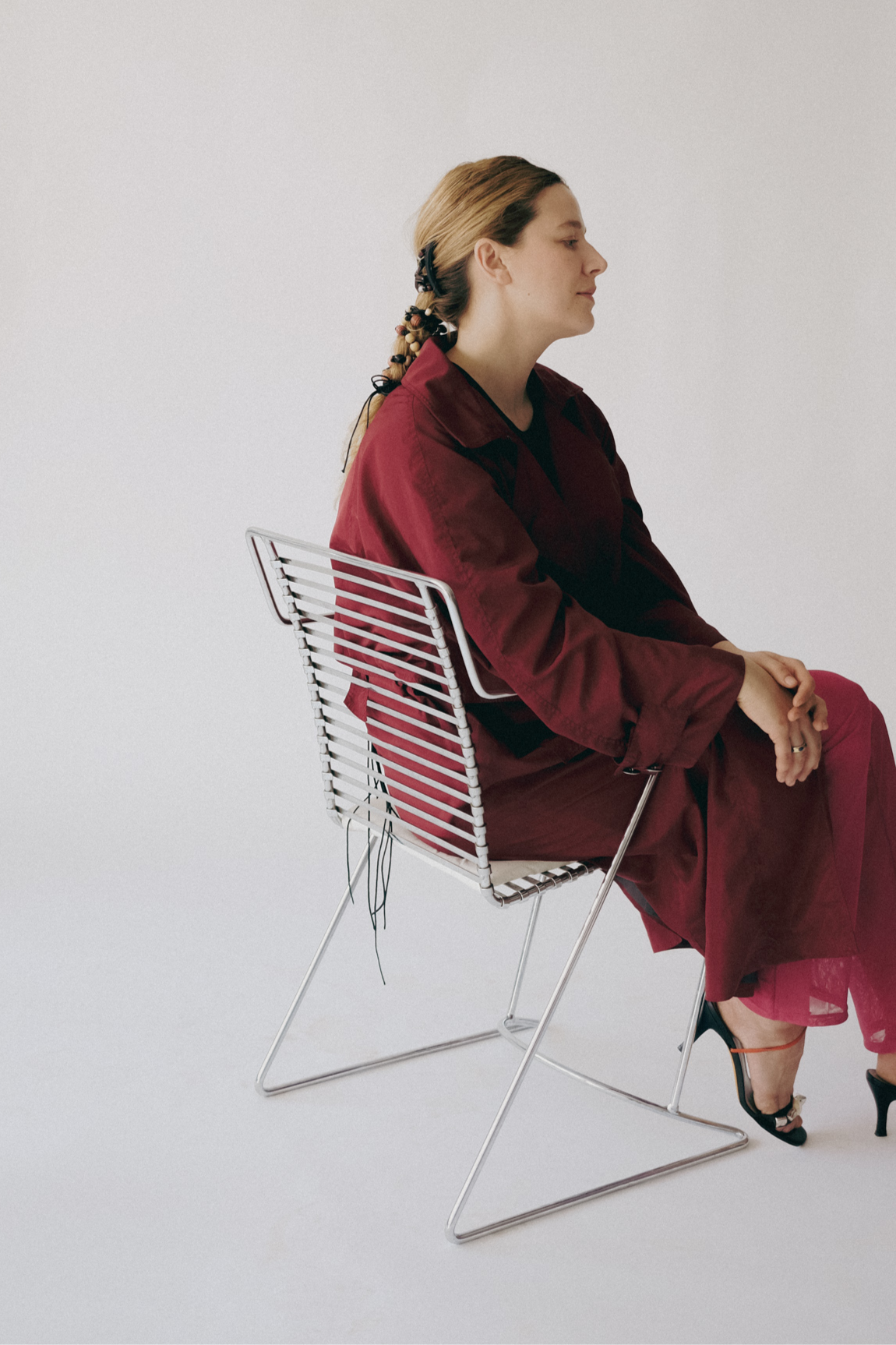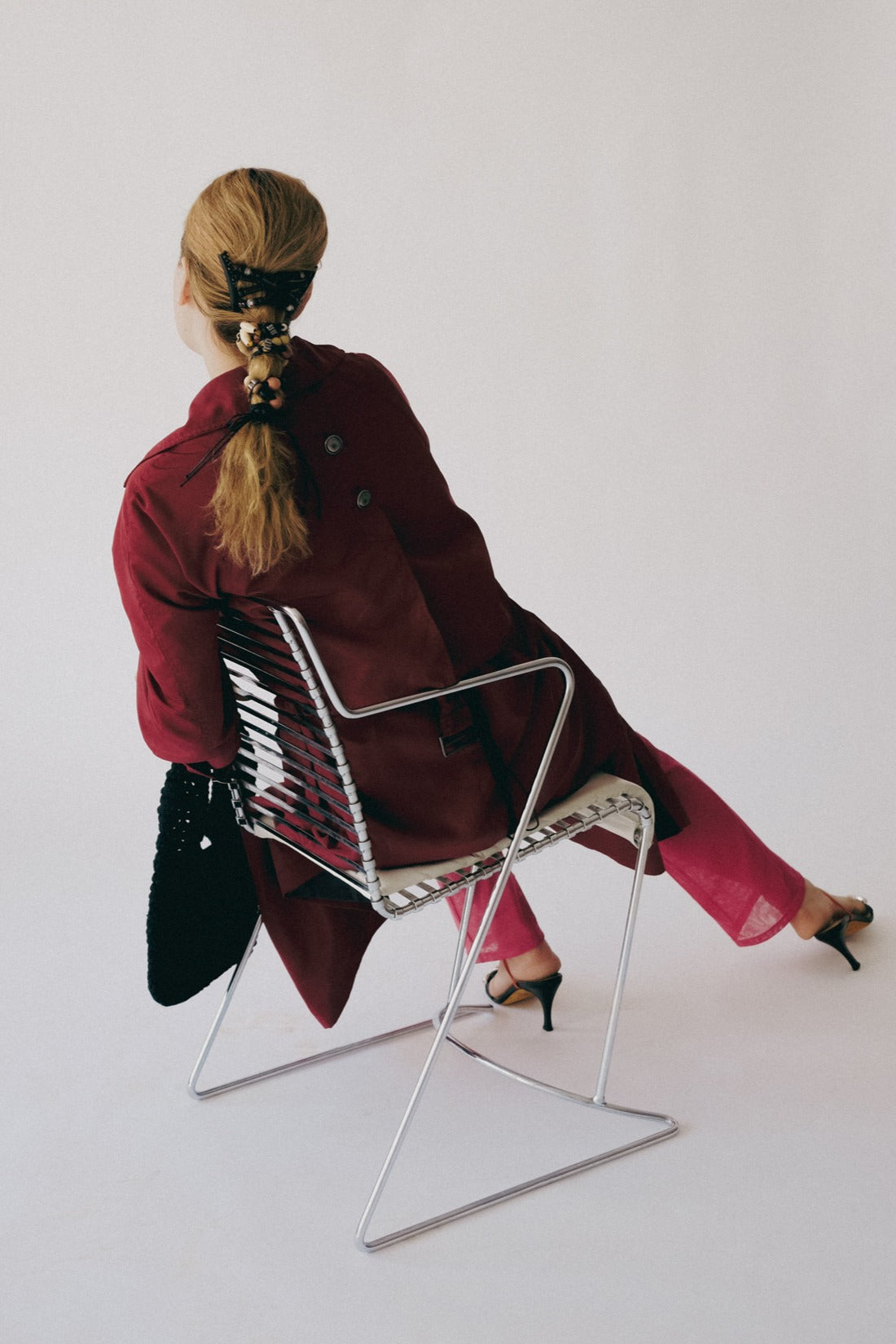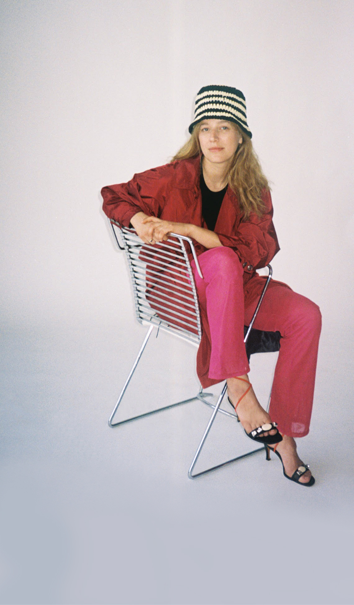 Nane styled by Gemsun and Alexis Badiyi wearing the the STRIPED HAT, the COAT in red and the MESH LEGGINGS