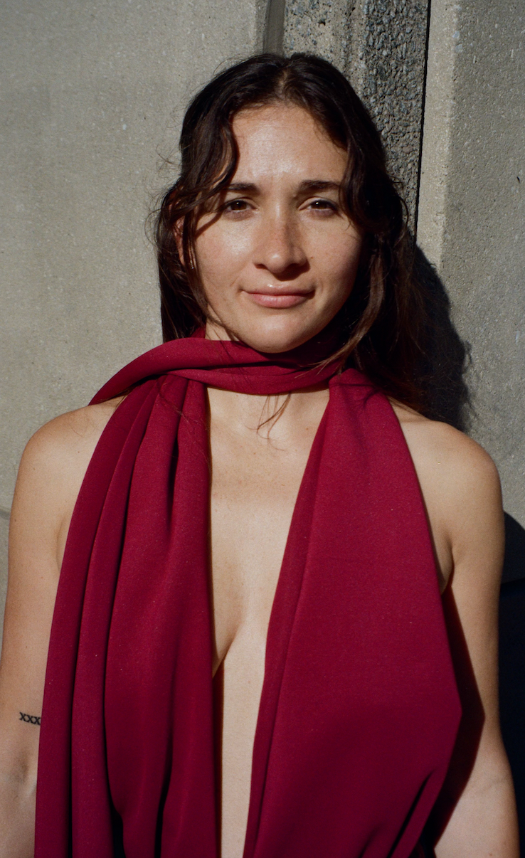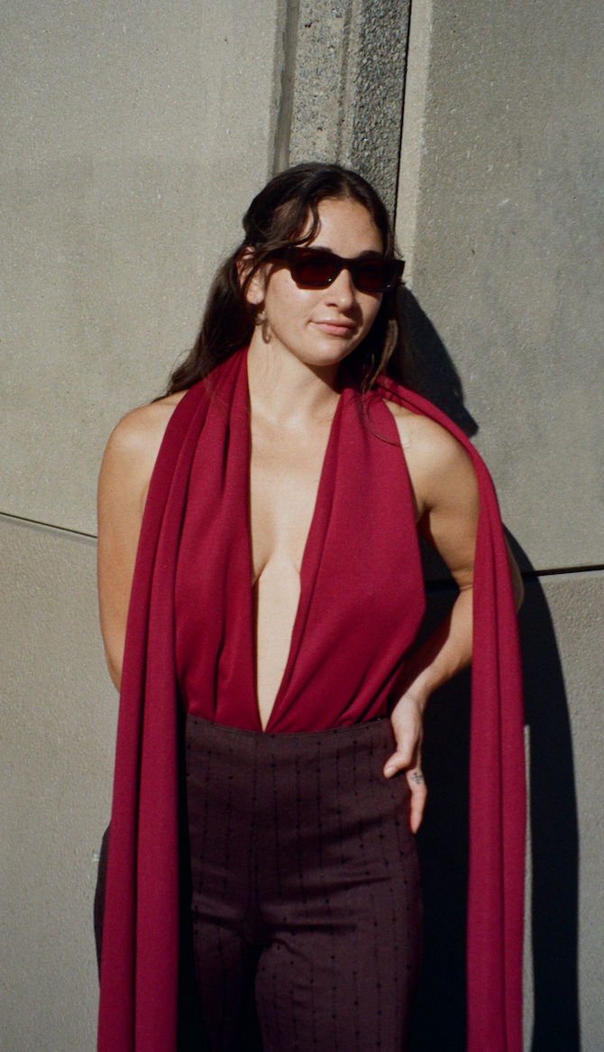 Maria is wearing the MONALISA BODYSUIT in burgundy, combined with the PRIMA LEGGINGS, and COAT. She is carrying the PLATTE BAG in gold.
