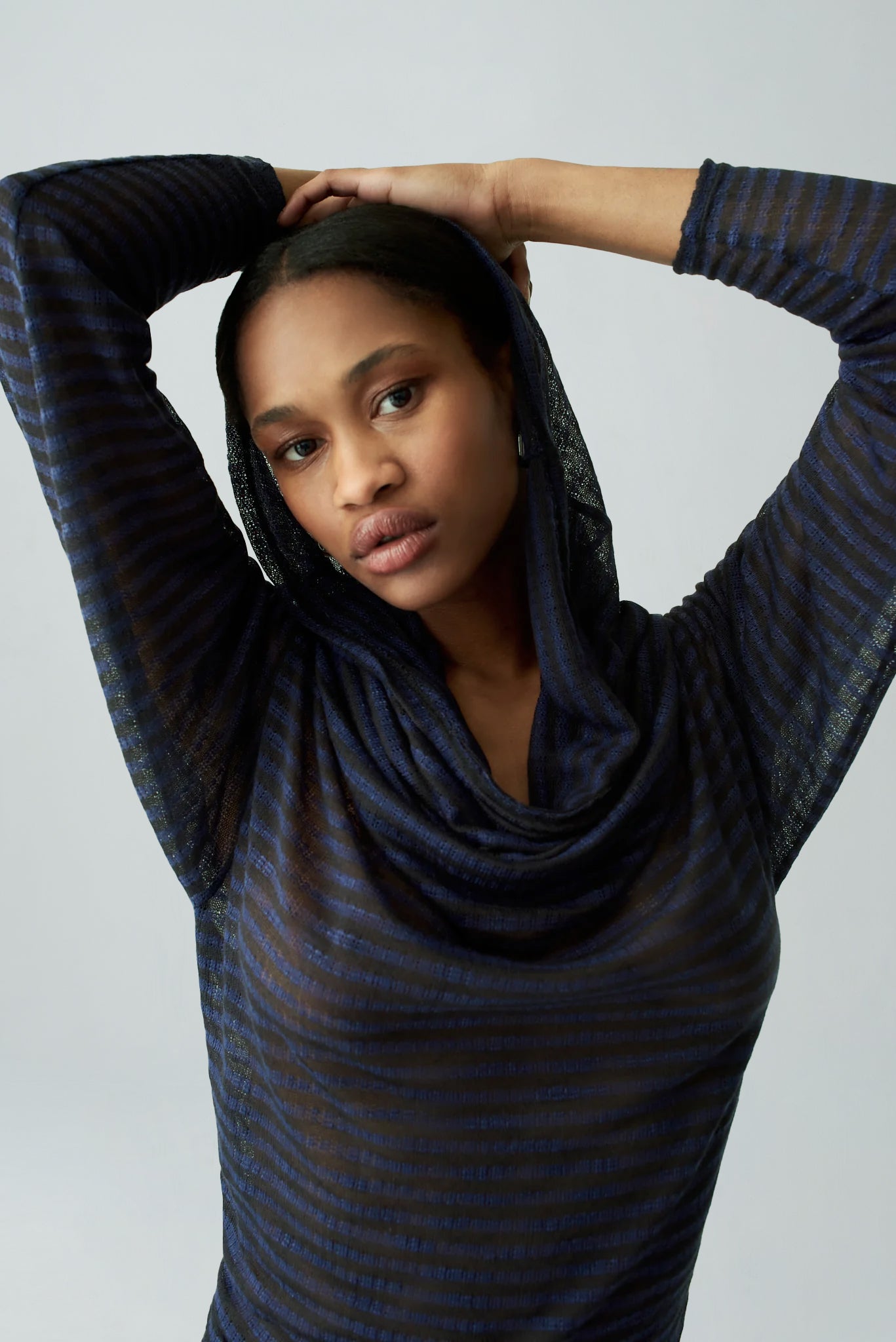 Ayan is wearing the DRAPED PULLOVER in navy in size M.