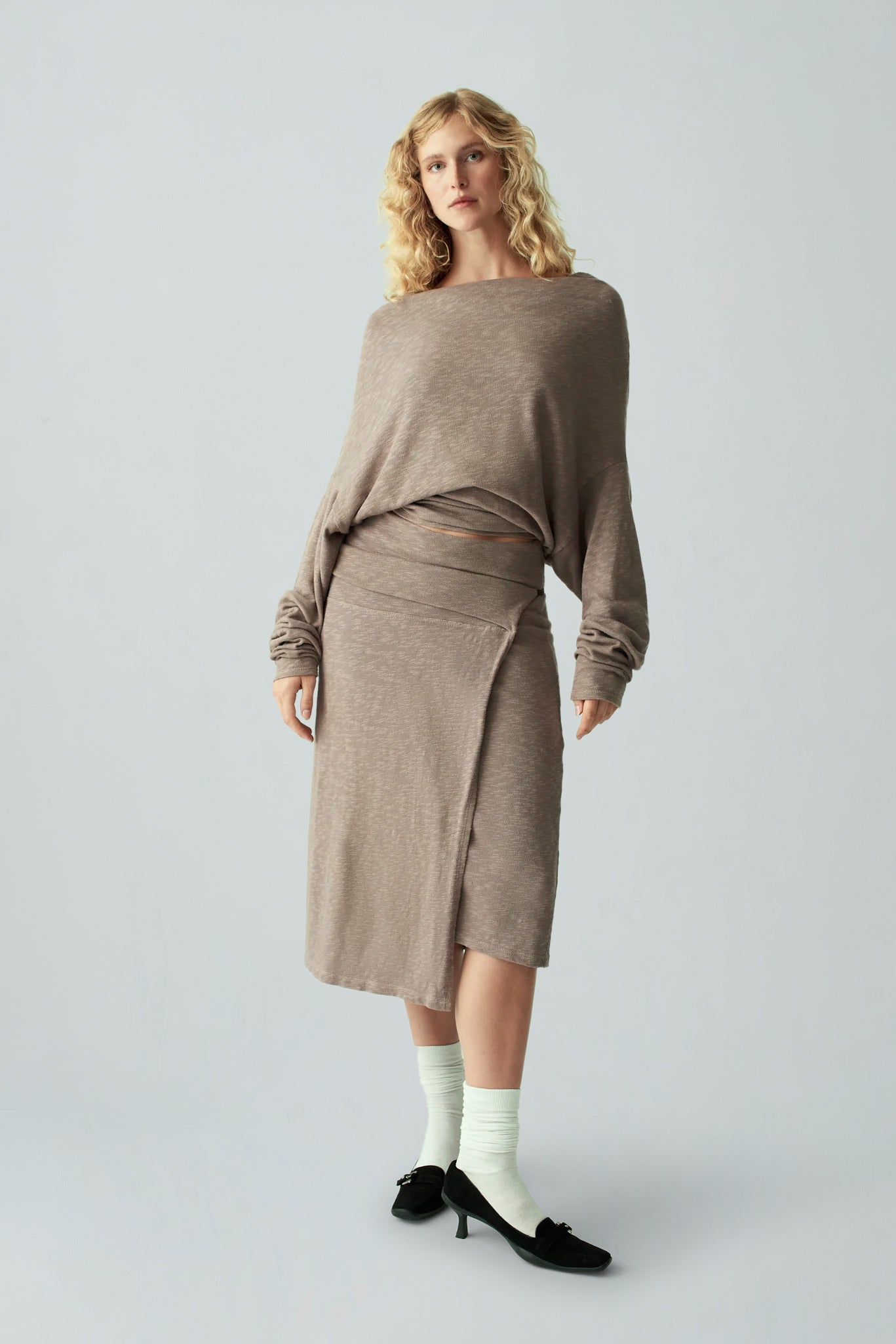 Allegra is wearing the DRAPED PULLOVER in mauve in size M.