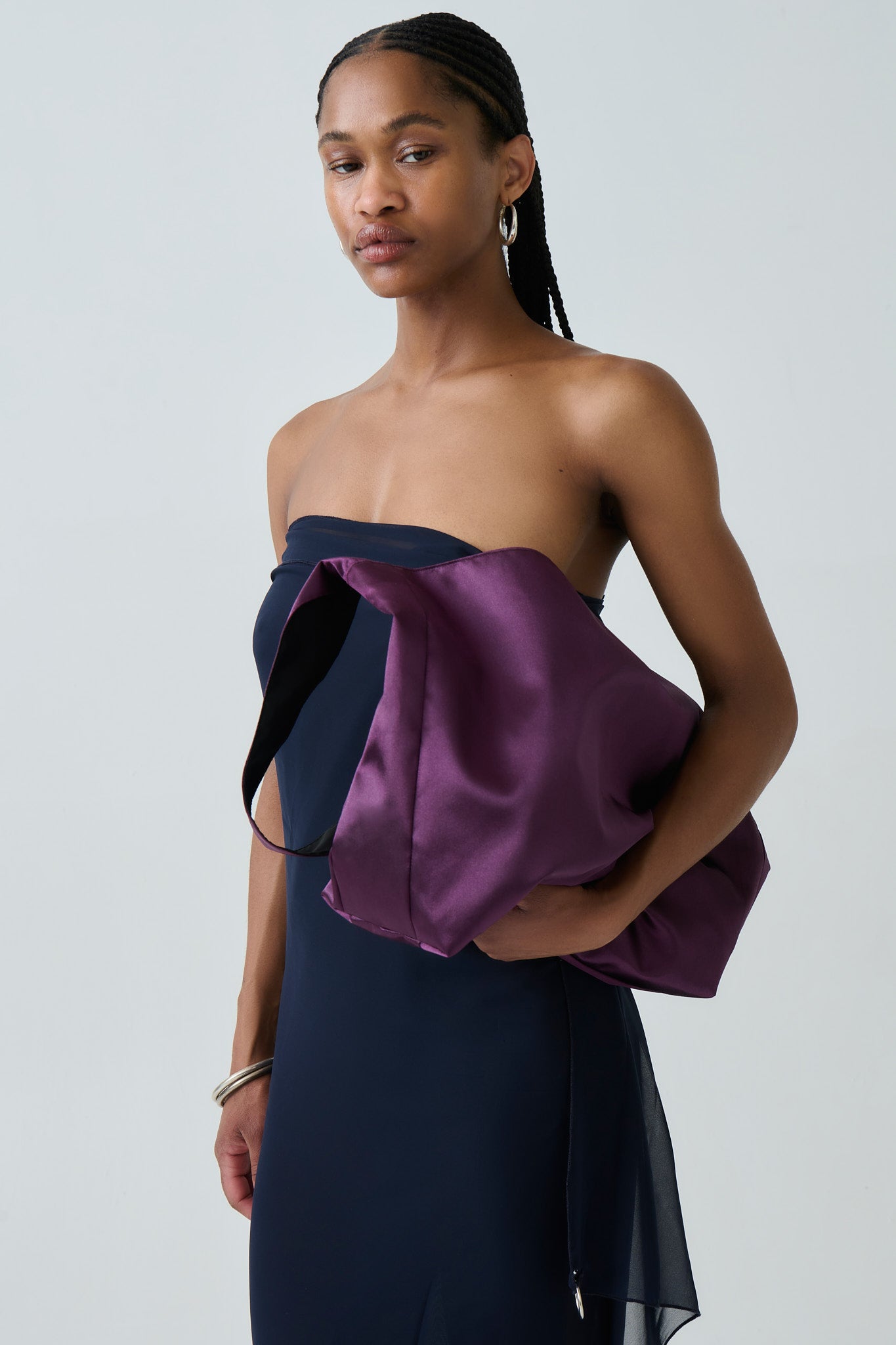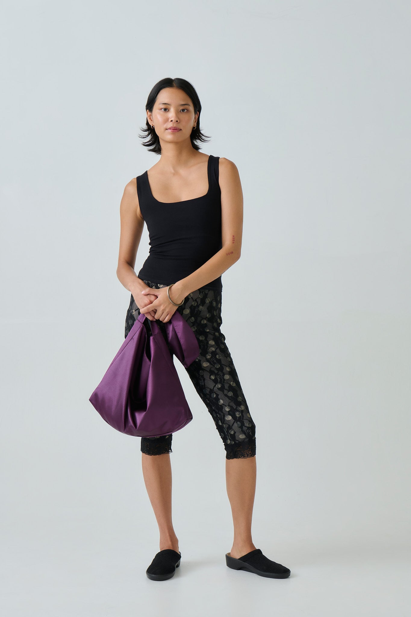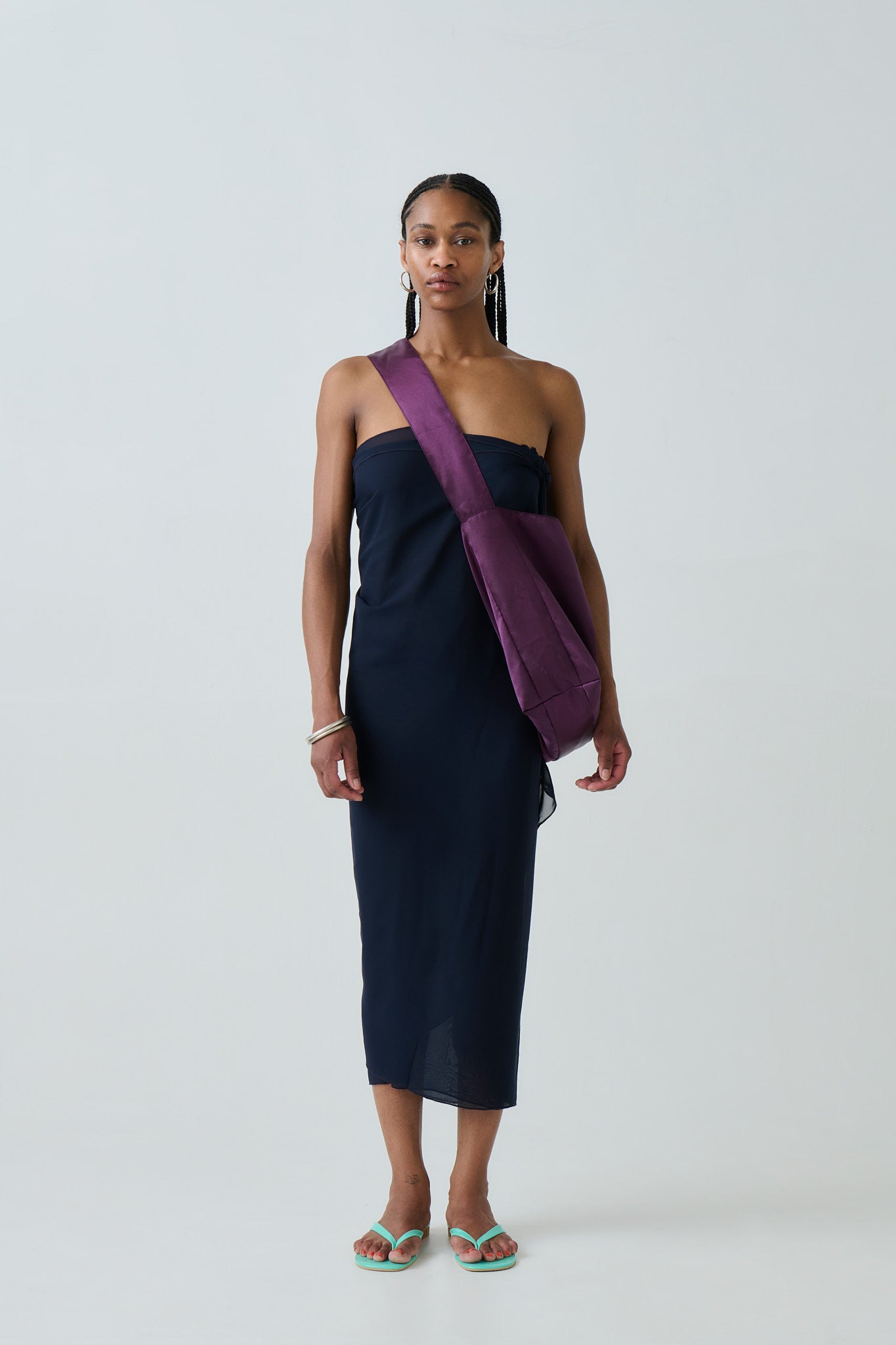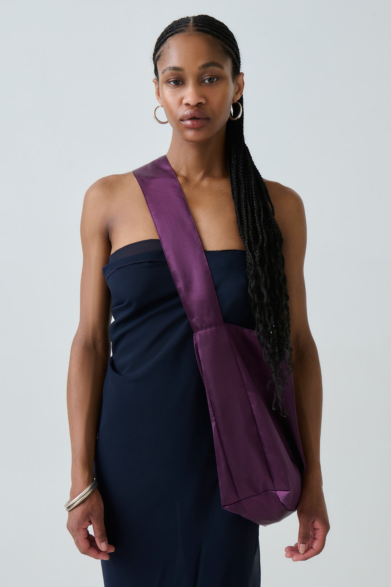 The purple, brown and black HELMI TOTE comes with a closed strap. The navy HELMI TOTE comes with an open strap. Handmade by women in the US.