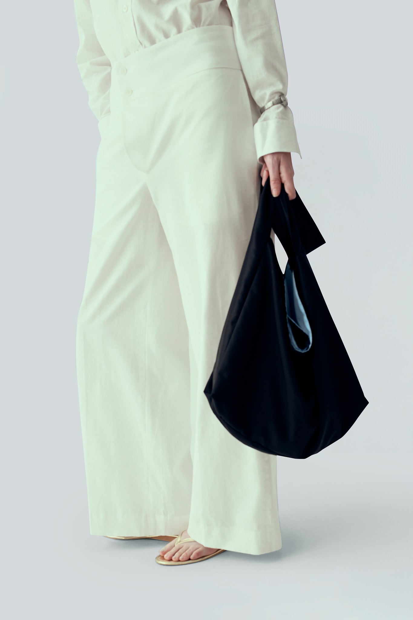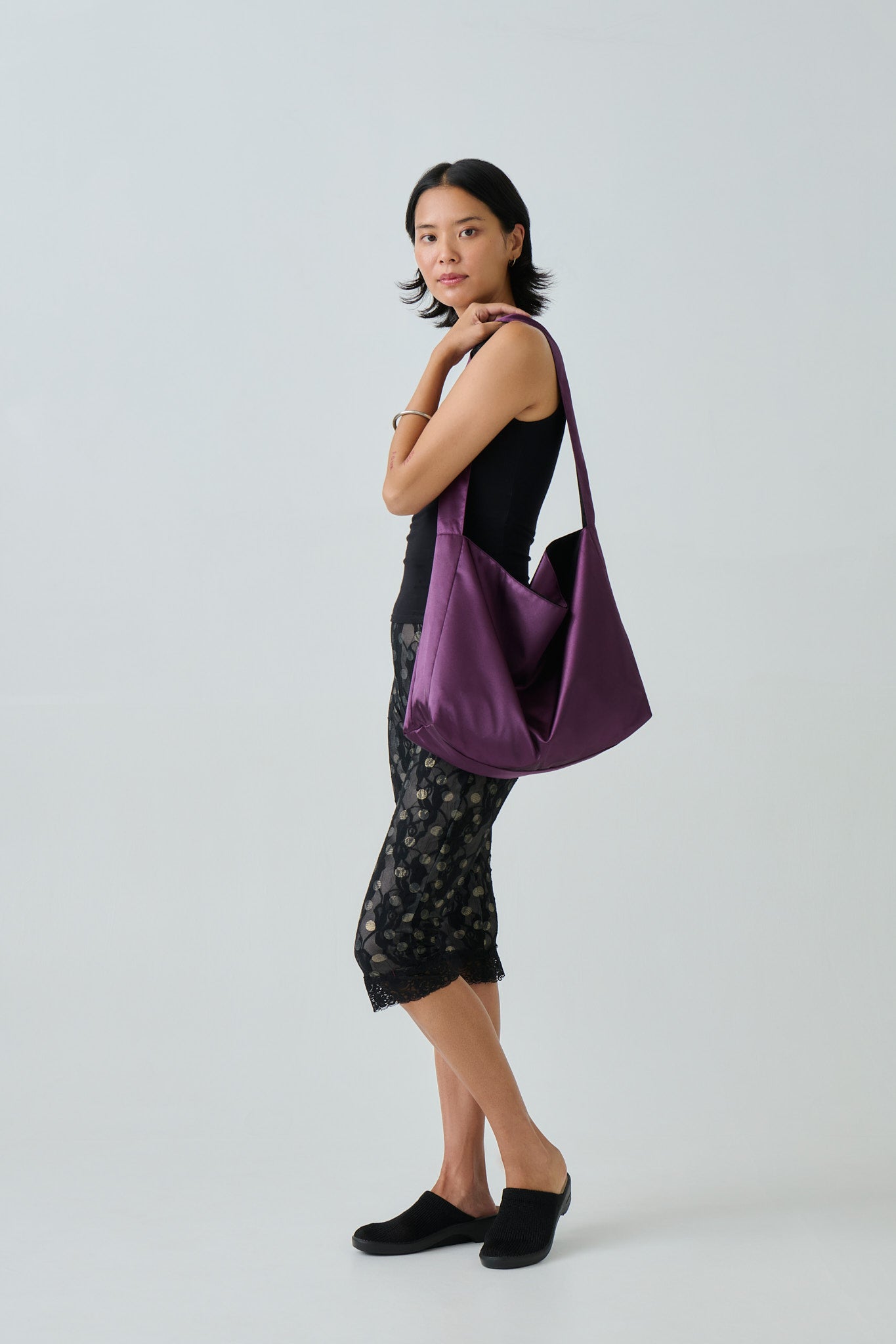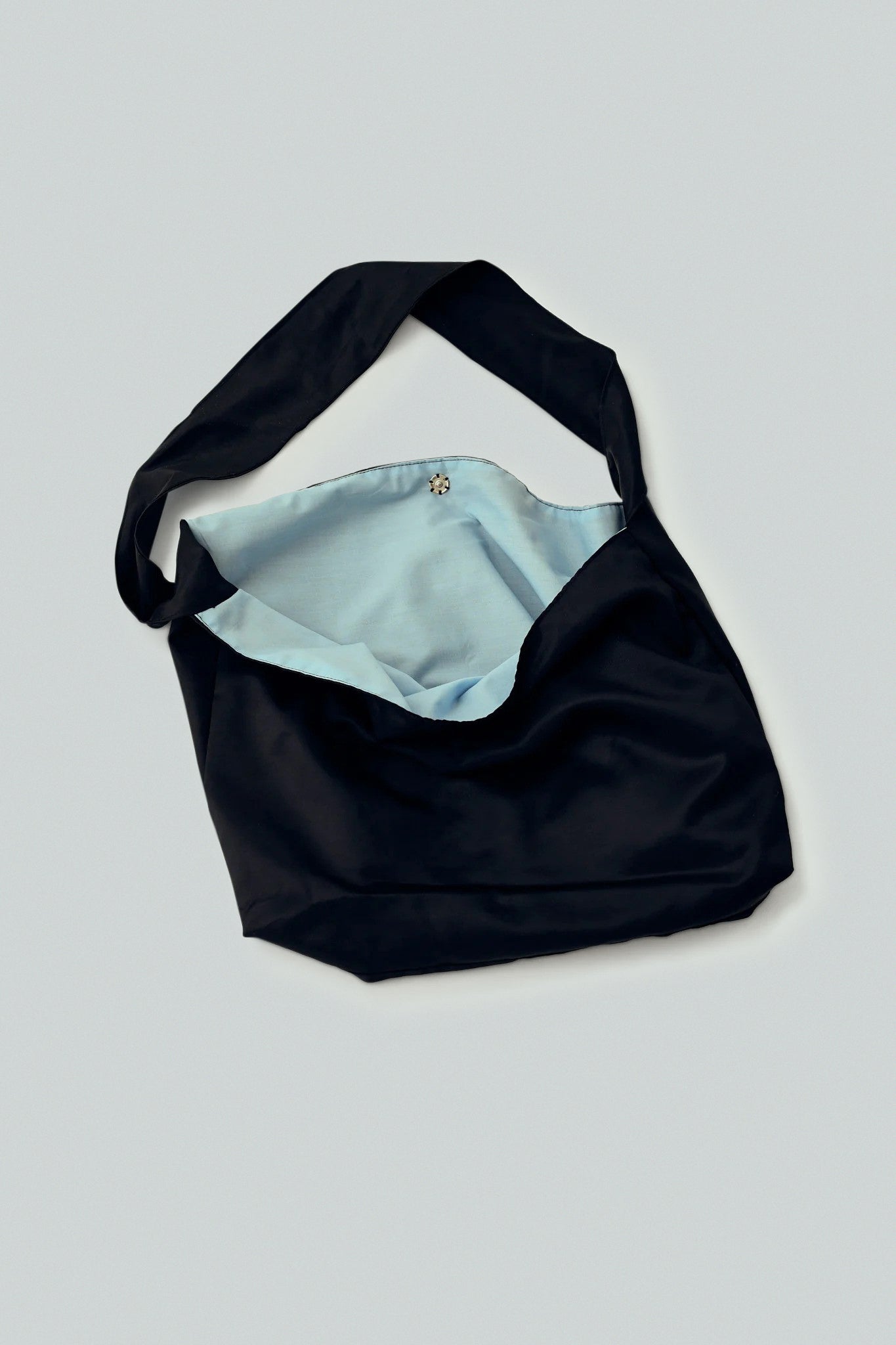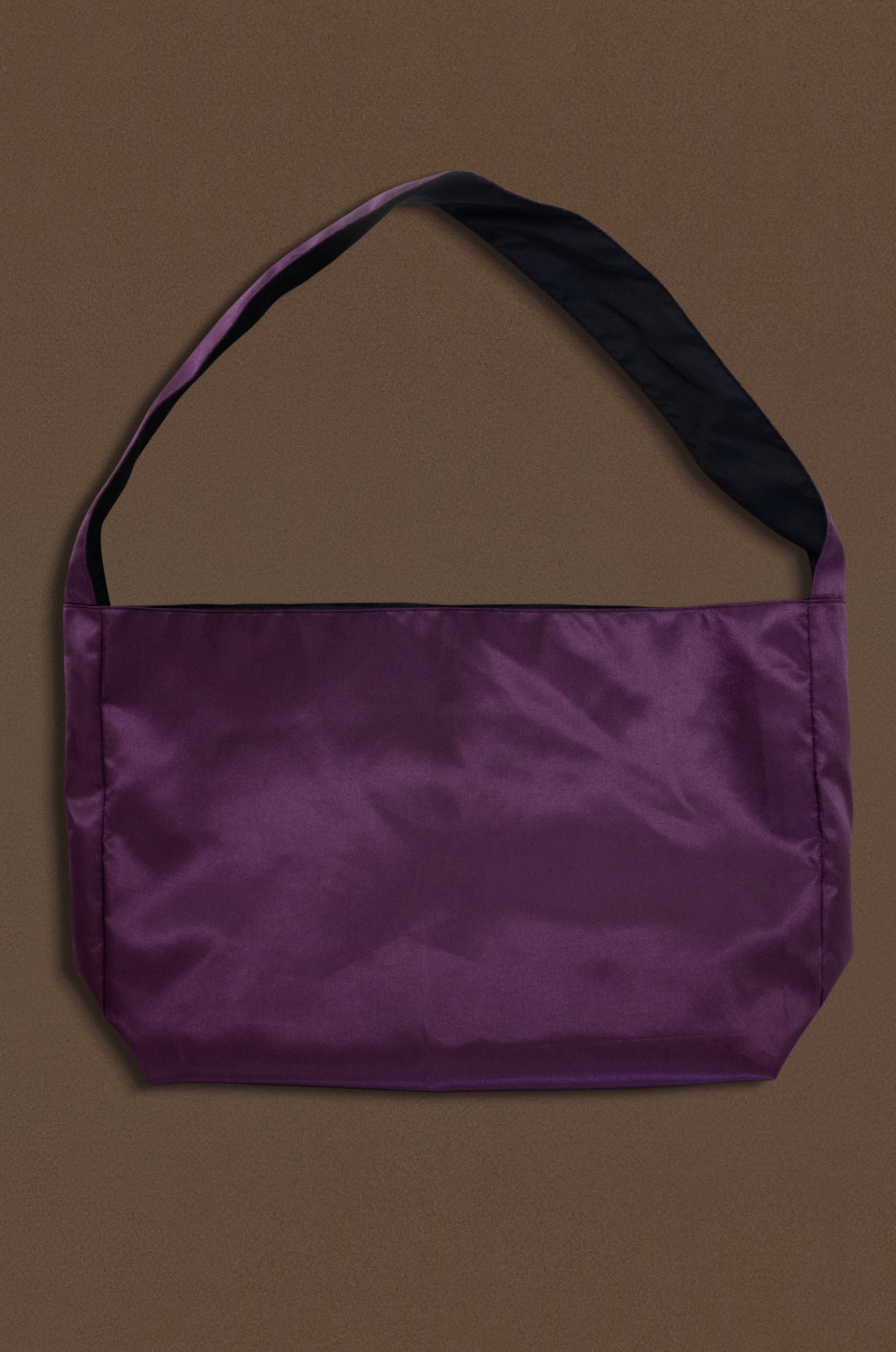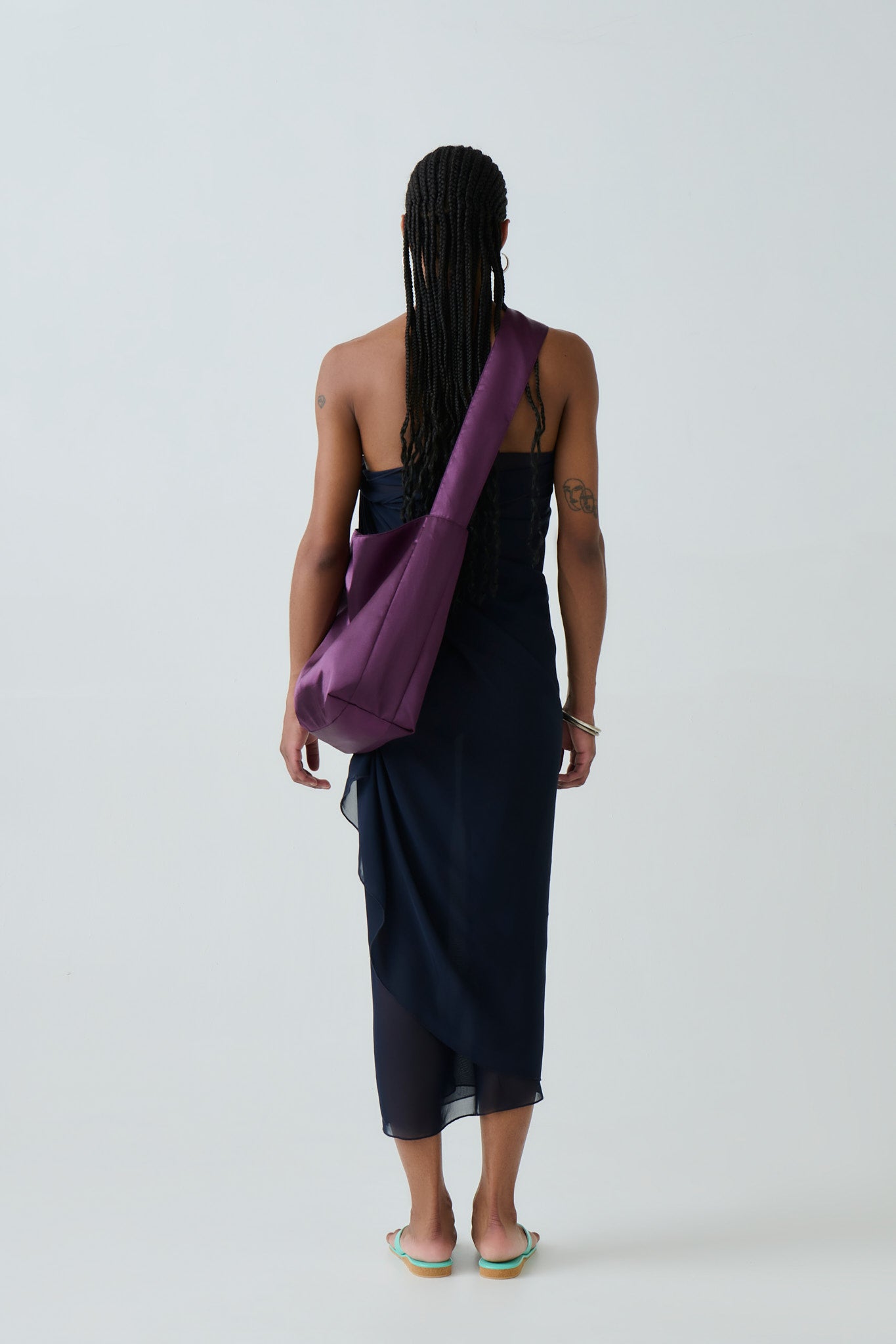 The purple, brown and black HELMI TOTE comes with a closed strap. The navy HELMI TOTE comes with an open strap. Handmade by women in the US.