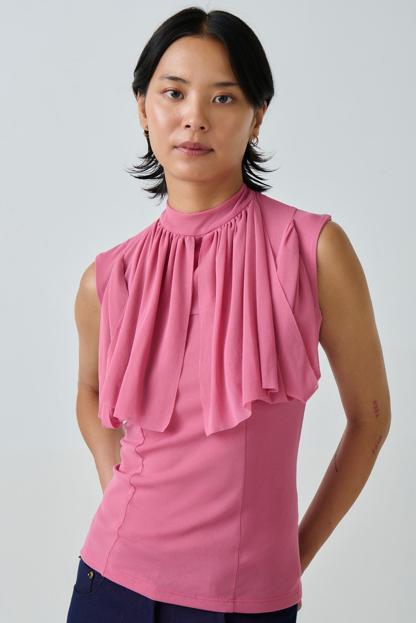 Soft layers of stretchy mesh and a whimsical collar - the Ola Top is inspired by waterfalls and their organic flow. A fitted top that is closed with a shiny shank button on the back.