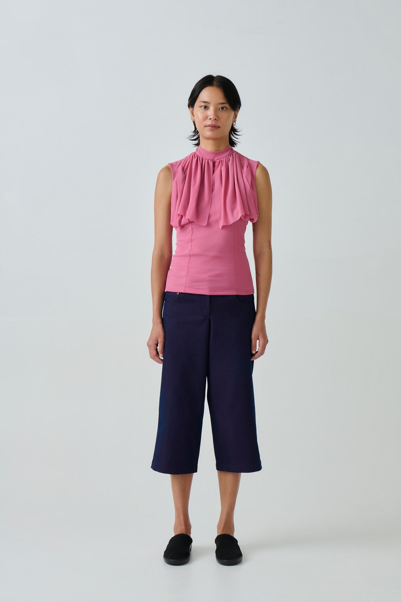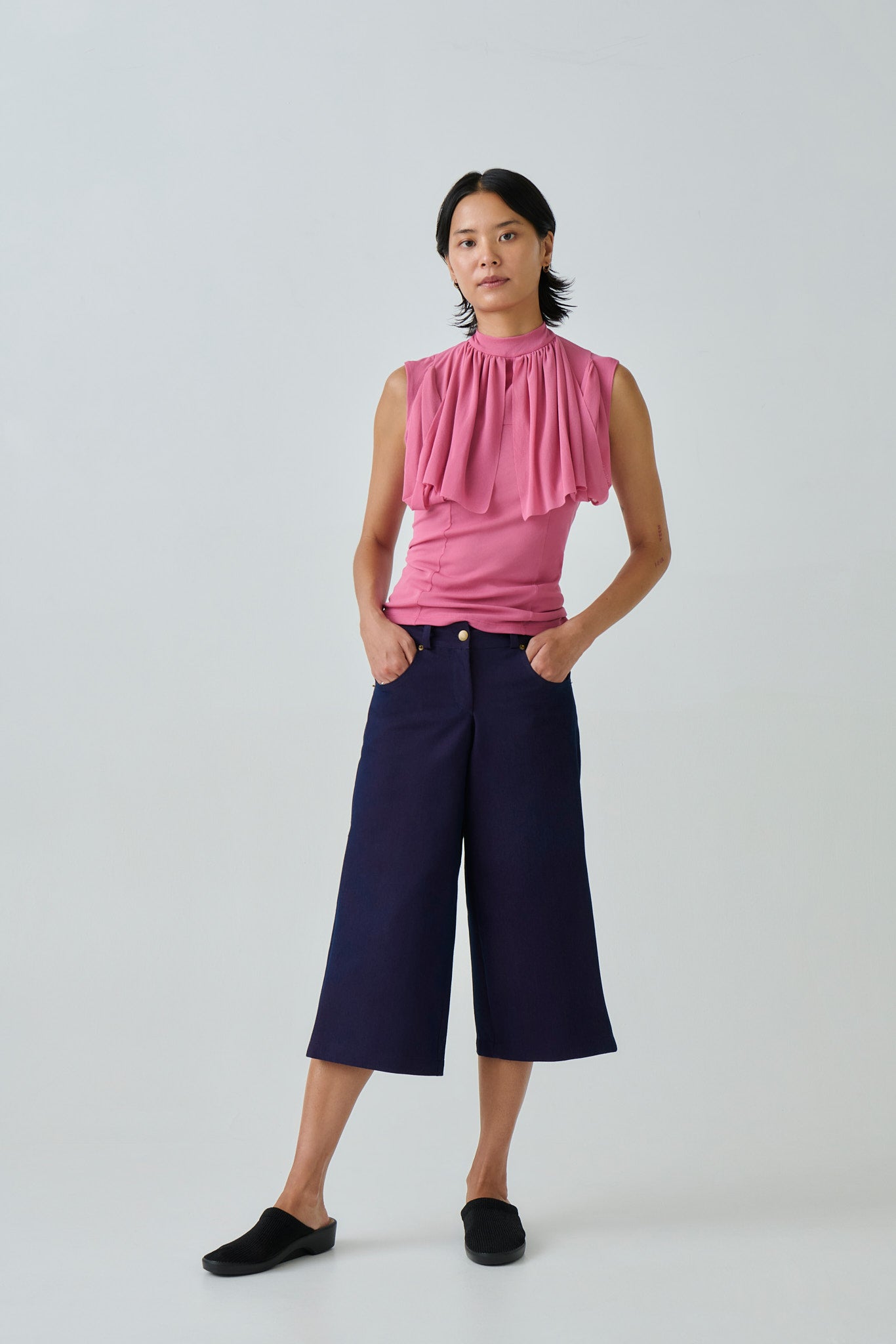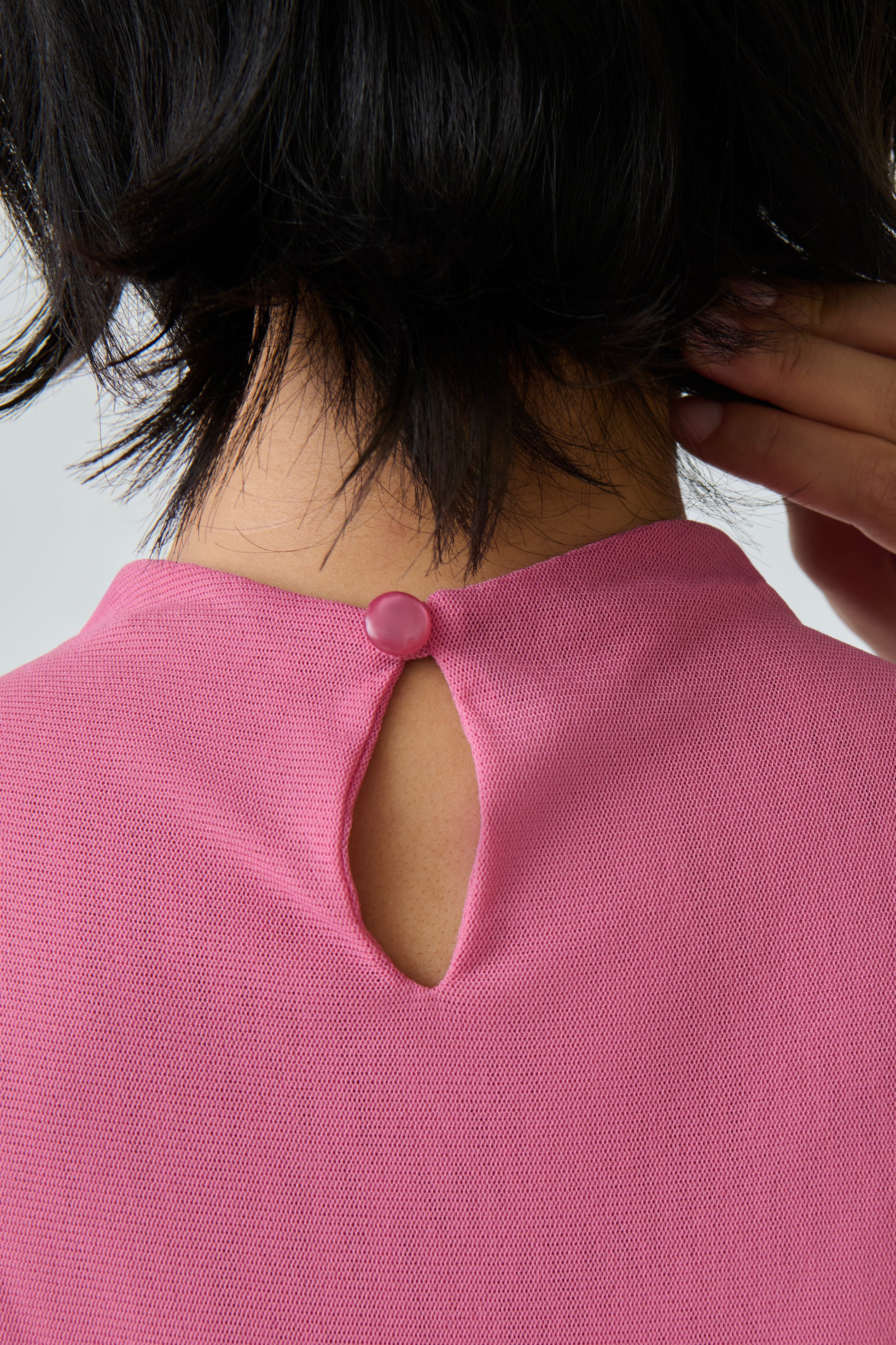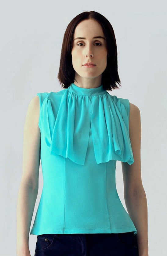 Soft layers of stretchy mesh and a whimsical collar - the Ola Top is inspired by waterfalls and their organic flow. A fitted top that is closed with a shiny shank button on the back.