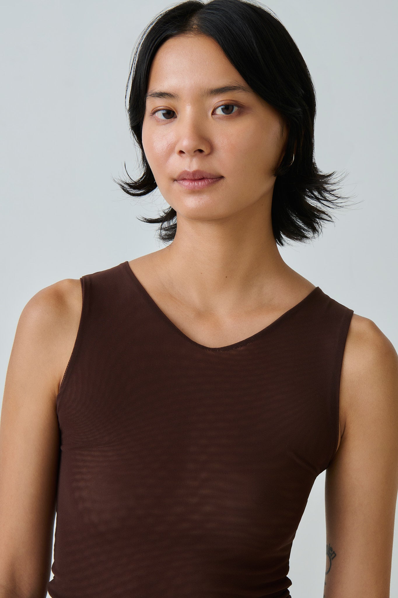 Like the Nore Top - the Nore Tank Top comes with layers of mesh, flatteringly encapsulating the body part. A curved top that is closed with a shiny shank button on the back.