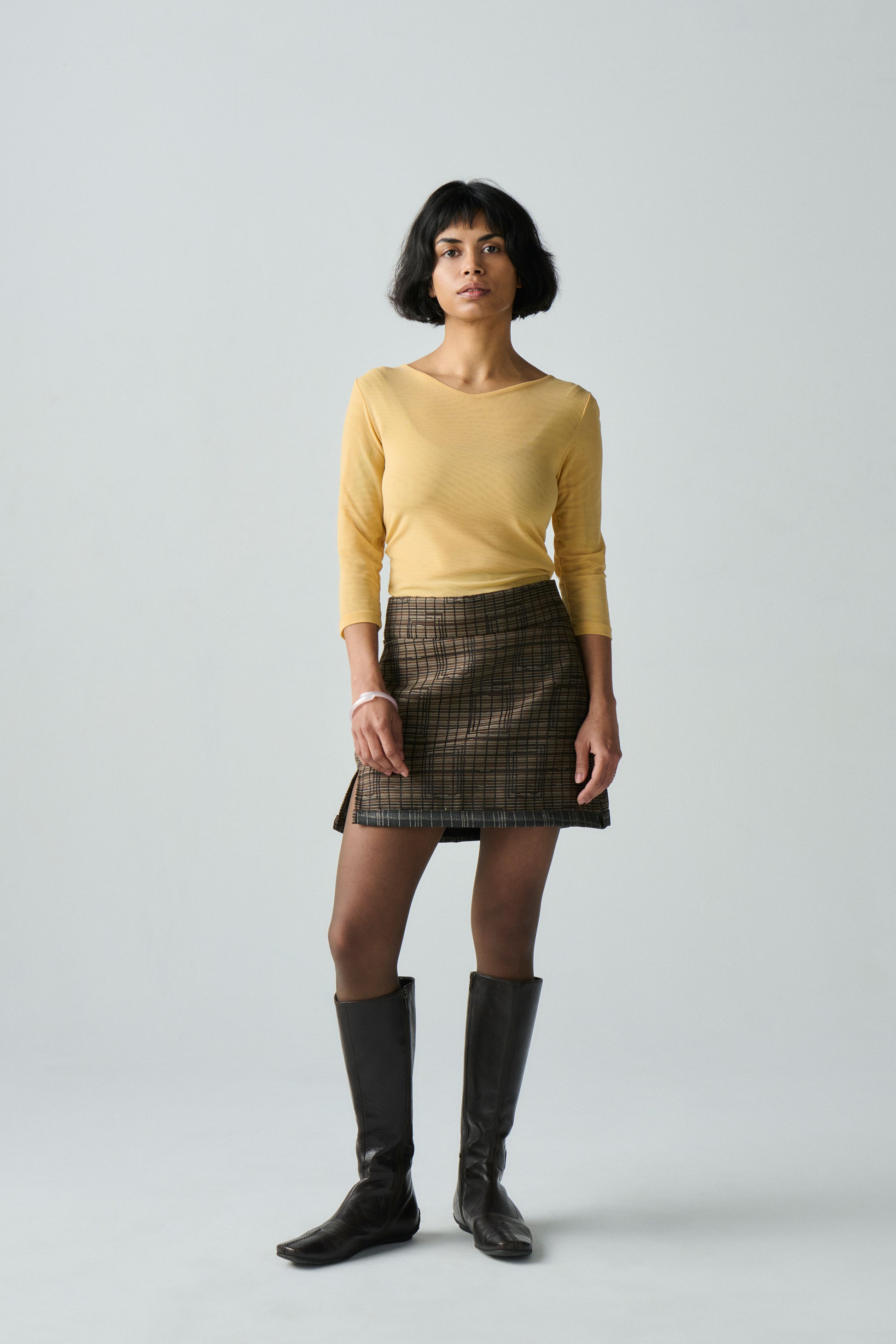Layers of mesh, flatteringly encapsulating the body part. The top has a curved hem in the front and is closed with a shiny shank button on the back. 3/4 length sleeves.