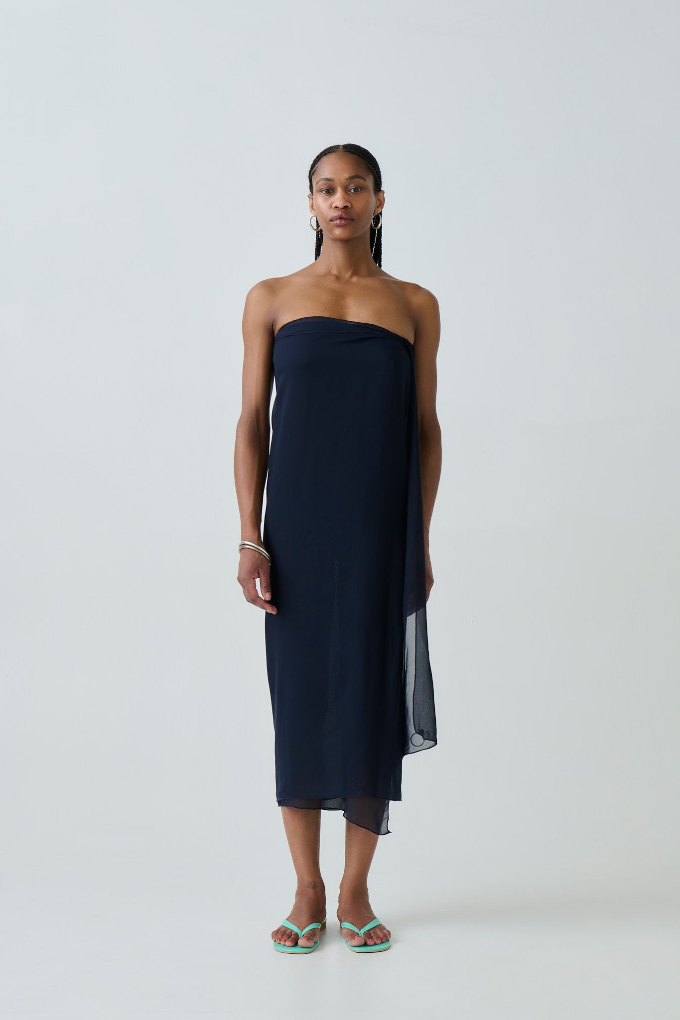 It is a spin on a classic oversized scarf, as this one comes with a silver ring in one of the corners. This allows simple and chic tying around the waist, the hips, the neck, or even as a head scarf.