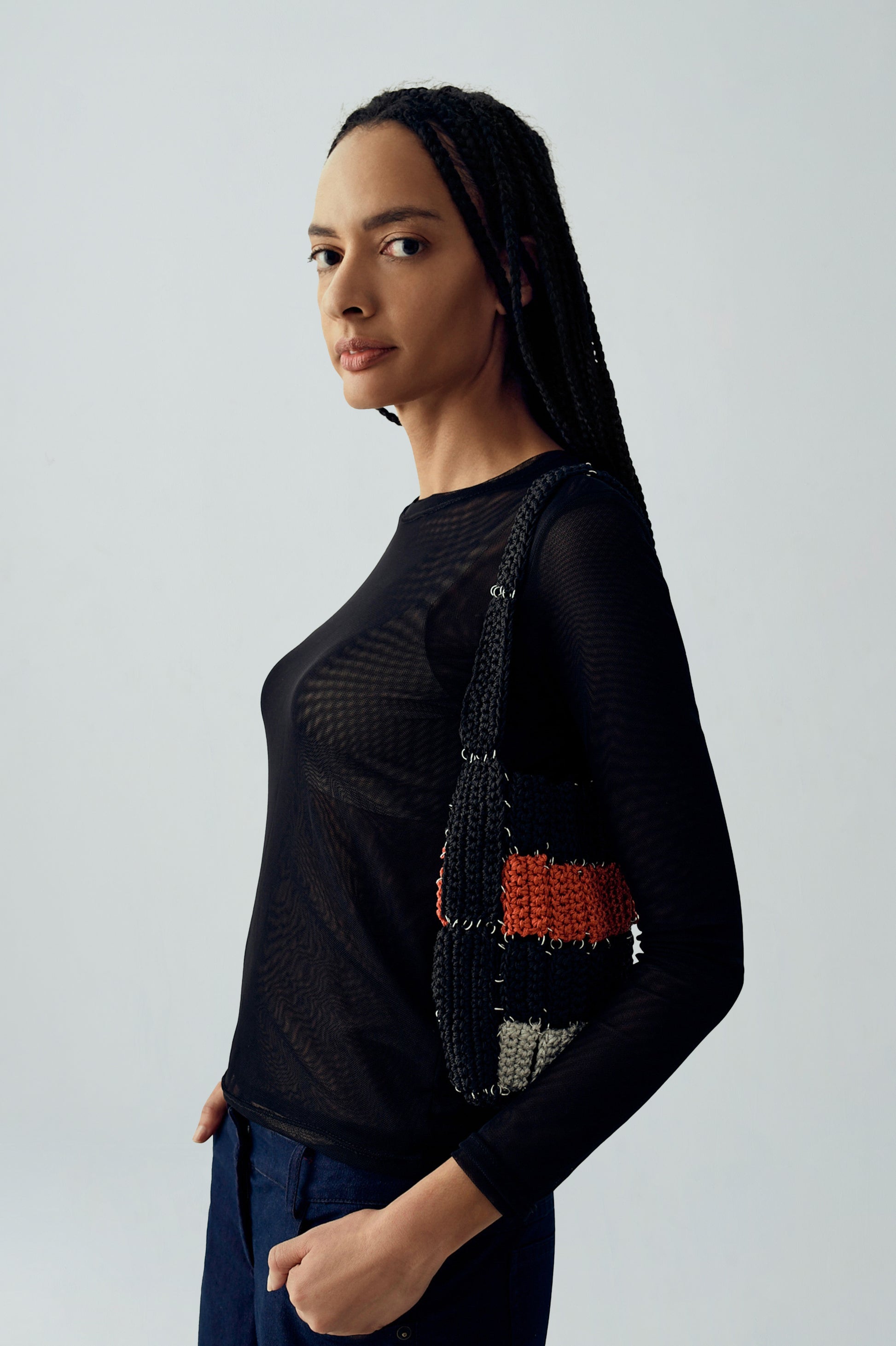 49 crochet patches made from recycled PET bottles, connected through over 250 silver coated jump rings create our PATCHES BAG.