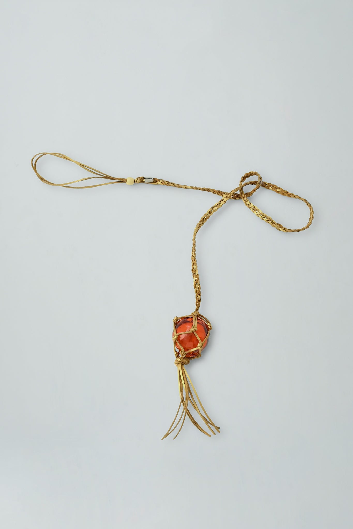 Inspired by glass fishing floats, the vessel belt is handmade with a 4-way braiding technique and includes a handblown glass ball. The length is freely adjustable.